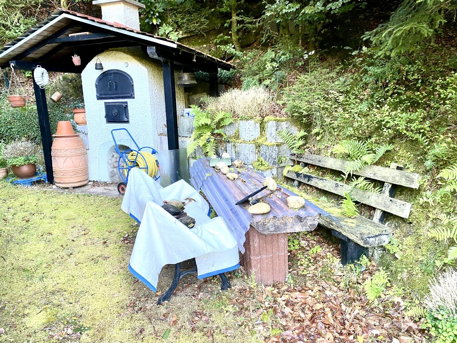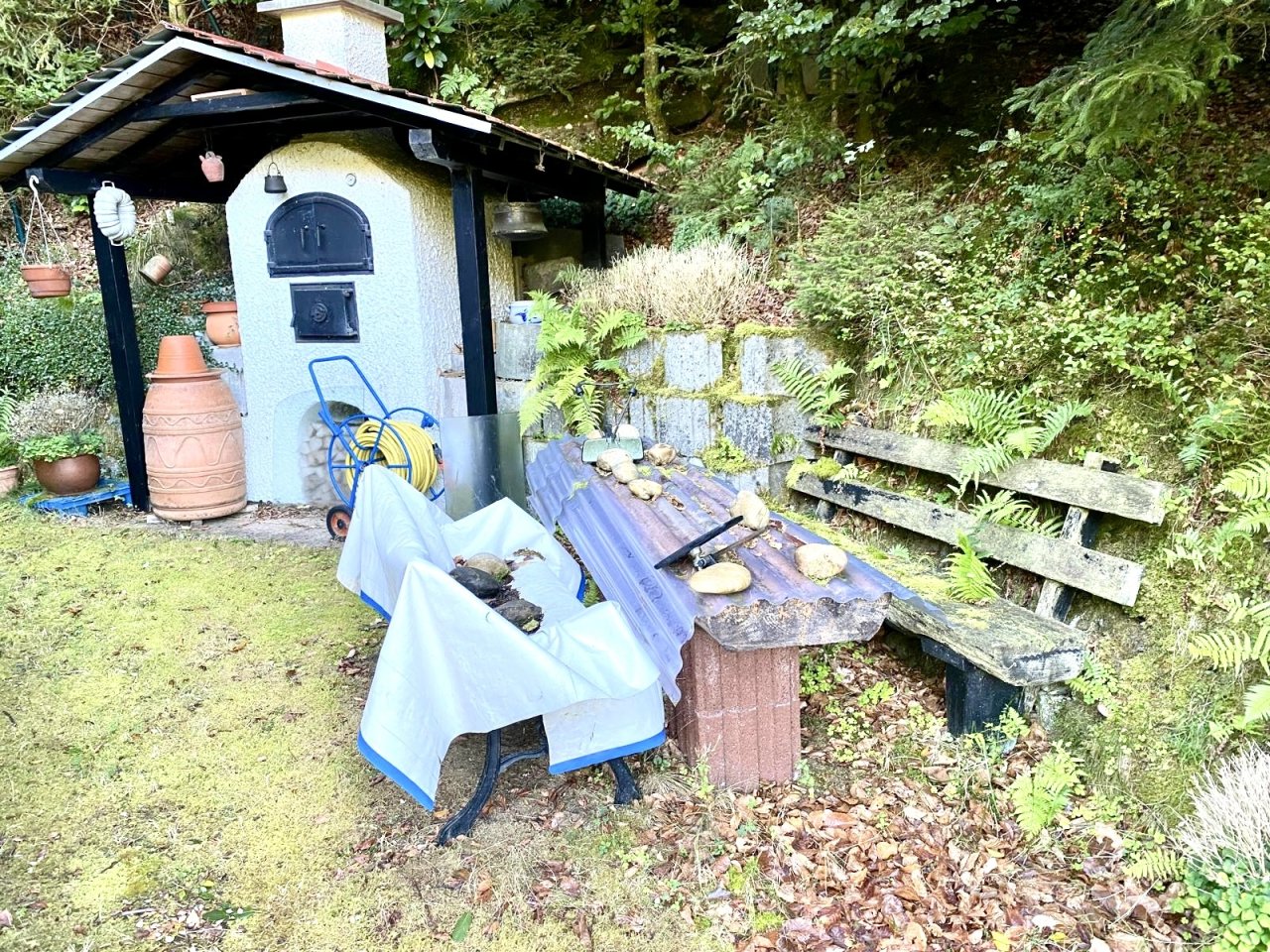 Eine Terrasse mit Südausrichtung bietet eine schöne Aussicht auf die umliegende Landschaft. Ein Stellplatz sowie ein Backofen sind ebenfalls vorhanden.