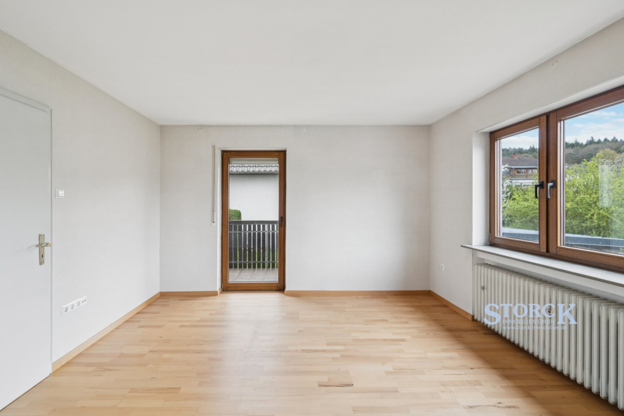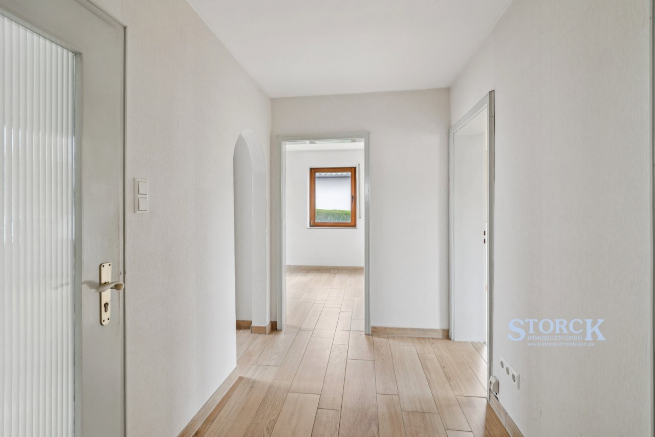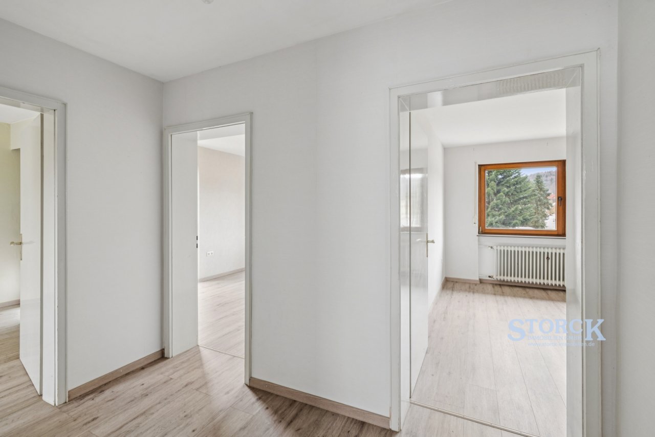 Im Obergeschoss befinden sich drei Schlafzimmer, ein Badezimmer sowie ein Flur, ebenfalls mit Balkonanschluss.